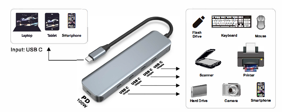 【5个端口 USB C 适配器】 MacBook USB C HUB 有 4 个 usB C 数据端口和 100W USB C 集线器供电,以满足您的日常需求,USB C端口扩展器可以将更多 TYPE-C 端口设备连接到您的笔记本电脑。
